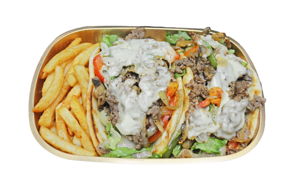 Stuffed baked potato with your choice of meat (Chicken, Lamb, or Mix), sautéed onions & peppers, sour cream, butter & shredded cheese.